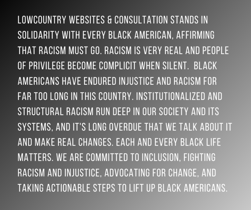 Lowcountry Websites & Consultation stands in solidarity with every Black American, affirming that racism must GO. Racism is very real and people of privilege become complicit when silent. Black Americans have endured injustice and racism for far too long in this country. Institutionalized and structural racism run deep in our society and its systems, and it’s long overdue that we talk about it and make REAL CHANGES. Each and every BLACK LIFE MATTERS. We are committed to inclusion, fighting racism and injustice, advocating for change, and taking actionable steps to lift up Black Americans.